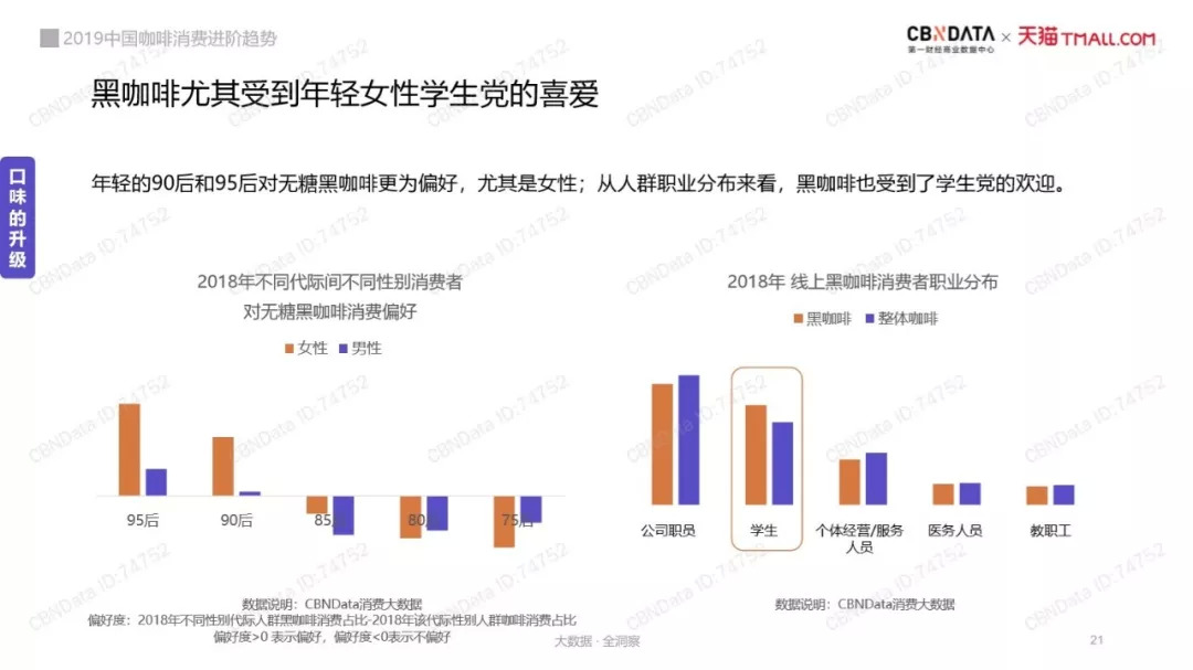 实际上,黑咖啡已经不止是小众的选择,CBNData联合天猫发布的《2019中国咖啡消费进阶趋势》显示,越来越多年轻的90后和95后开始喜欢黑咖啡,尤其是女性;从人群职业分布来看,黑咖啡也更受到学生党的欢迎[4]。可以预见,未来无糖的黑咖啡将成为咖啡界的一匹“黑马”。