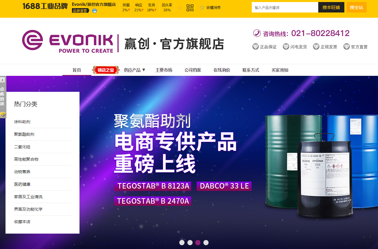 2017年11月,赢创在阿里巴巴旗下B2B业务平台1688.com的工业品牌站开设了旗舰店,尝试通过互联网销售公司所生产的特种化工品。事实上,4个月前,这家化工巨头就在京东的全球购平台创立了线上店铺,向普通消费者销售一款名为MEDOX的高含量花青素营养品。