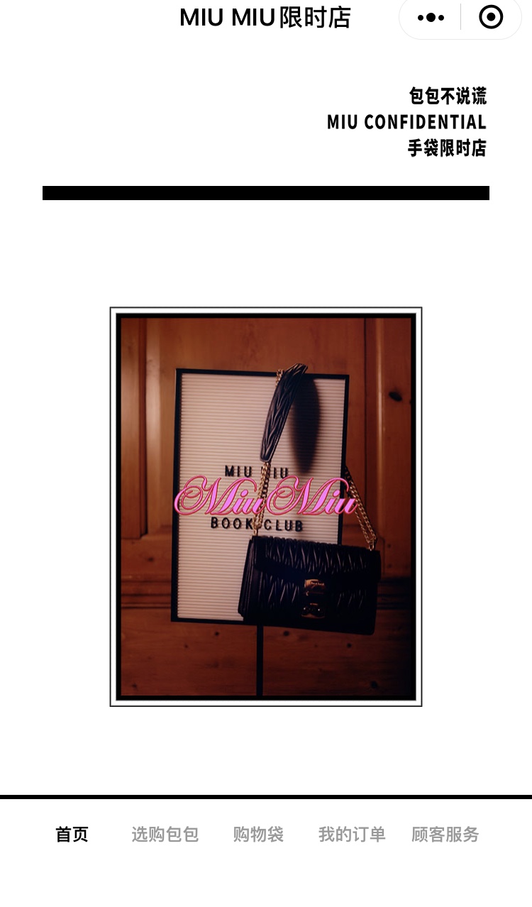 通过微信小程序搜索入口,检索关键字“MIU MIU”即可找到这个名为“MIU MIU限时店”的小程序。点击进入后会发现,这个小程序更准确的名字为“包包不说谎 MIU CONFIDENTIAL手袋限时店”。这个名字简单直接地点名了限时店的主题——展示和销售这款名为MIU CONFIDENTIAL的包。