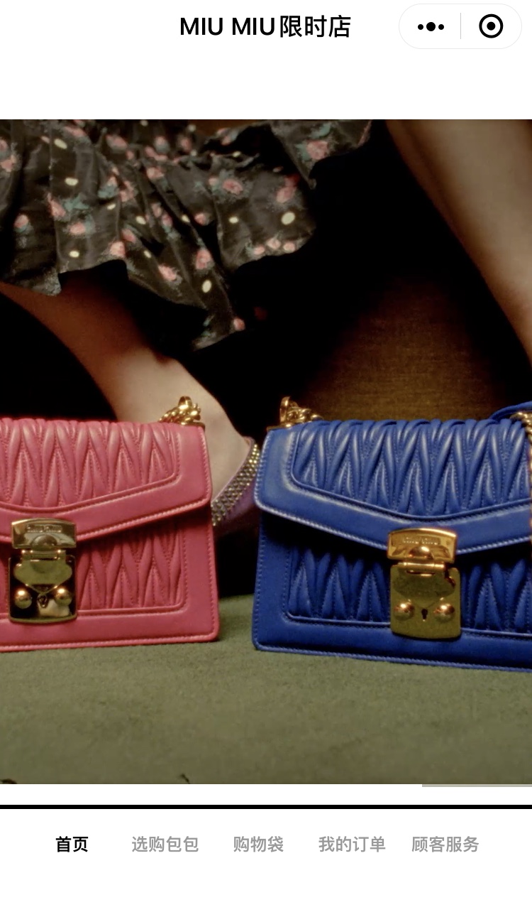 作为一家线上快闪店,MIU MIU限时店小程序亦配备了完整的购物功能,在页面最下方的导航条中可以看到选购、购物袋、订单及顾客服务导航的选项。目前,该款小程序共上新了10款色彩、皮革表面处理手法不同的MIU CONFIDENTIAL包袋。有需求的消费者可以零干扰的进行浏览及挑选。