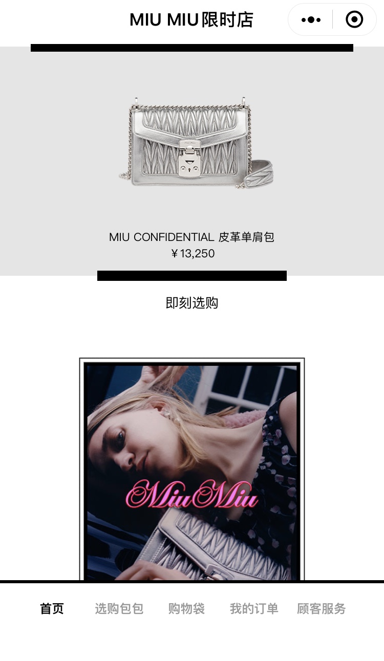 值得提到的是,这是MIU MIU在2014年进驻微信平台后,首次发布微信小程序。在此之前,MIU MIU已经通过微信公众号开通基于微信平台的电商渠道。界面时尚记者查询的结果显示,在该常规电商渠道,消费者亦能在包袋选购页面找到MIU CONFIDENTIAL包款,且可选颜色和材质更为丰富。但无需质疑的是,从品牌的角度出发,此次为MIU CONFIDENTIAL开设线上限时店可以为这款包袋吸引更精准的流量,也能更集中力量地对这款包袋进行推广和展示。