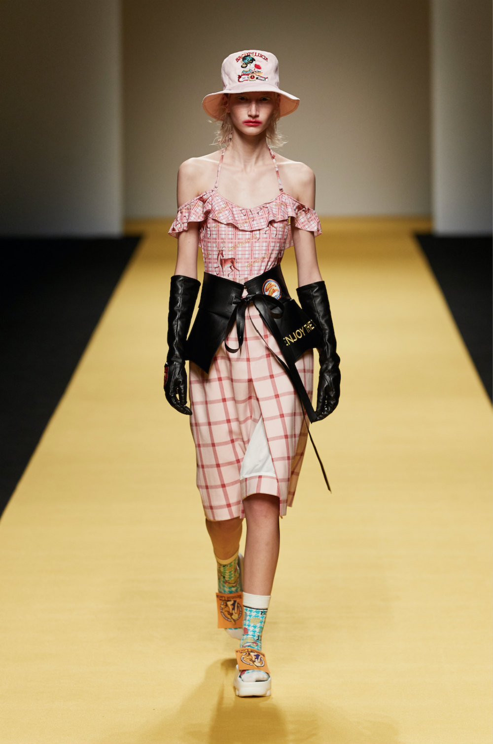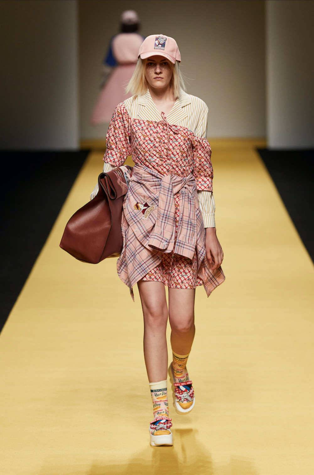 大片的糖果撞色,尤为突出的粉色西装套装,以及红,蓝腰封,透明绿色手袋都营造了不错的视觉效果。格纹元素更是经典中的经典,鲜艳的色块完美贴合了品牌特色。夸张的长袜搭配厚底拖鞋似乎会成为20年的流行趋势。