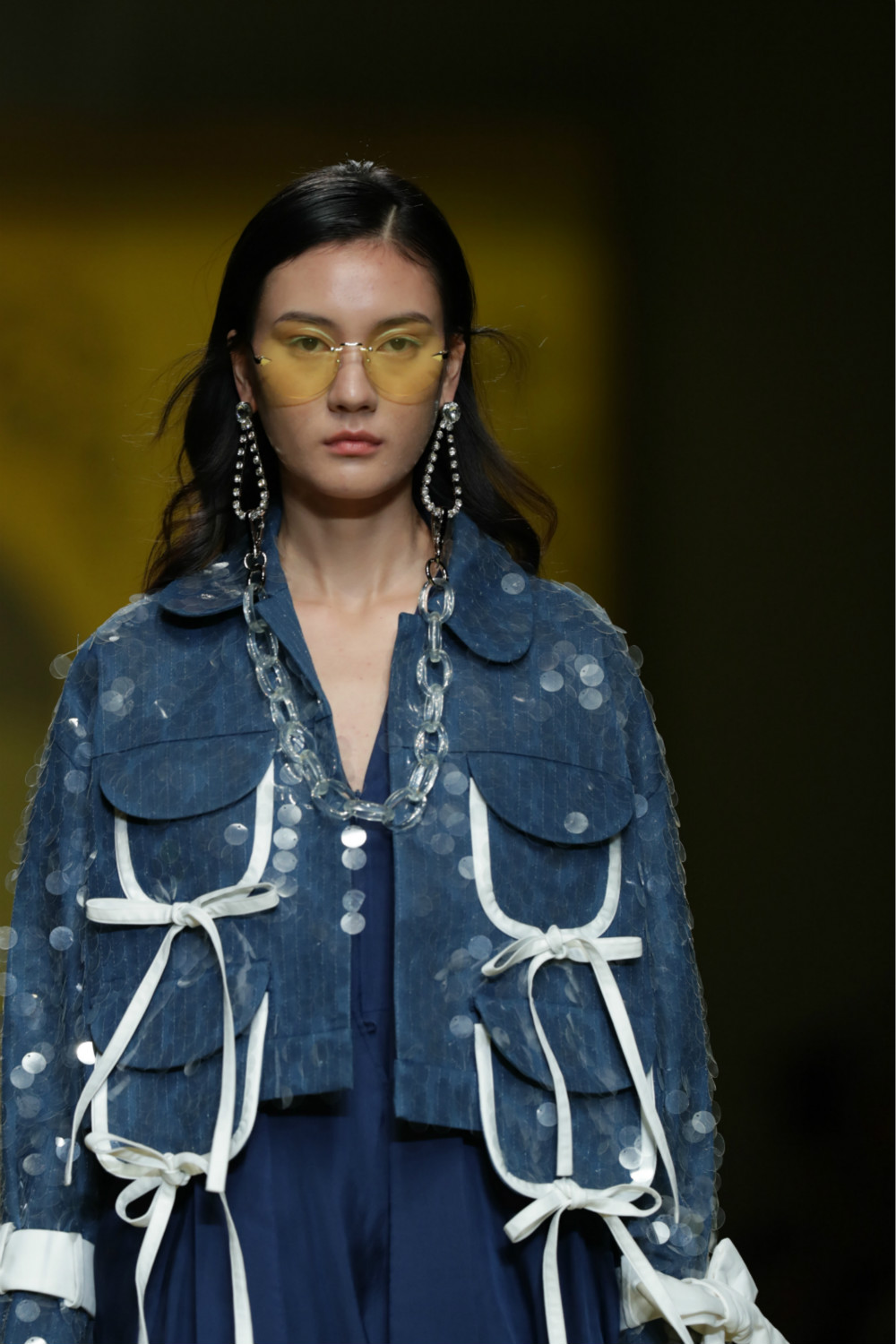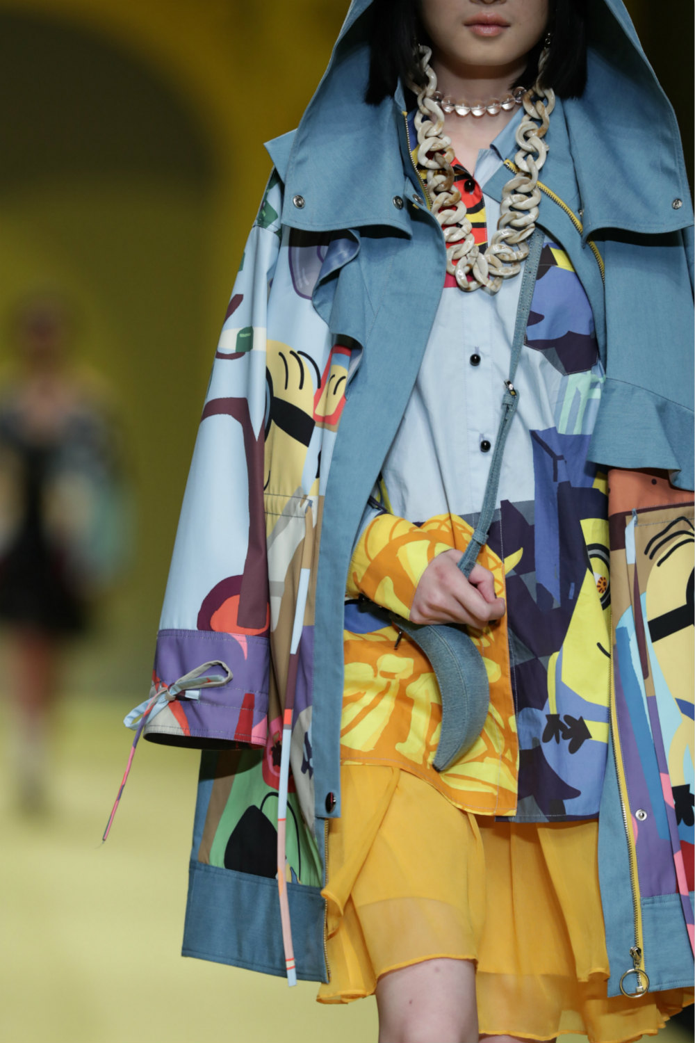 2020春夏系列中FLONAKED把小黄人做成印花,运用在外套、衣裙上和小挎包上。我们问FLONAKED的设计师张韵文,如何运用卡通IP而不幼稚?她在这一季中给出的解决办法是,印花上配以大量了植物、绿叶图案,以及使用亮片工艺,使其最终更加女性化。