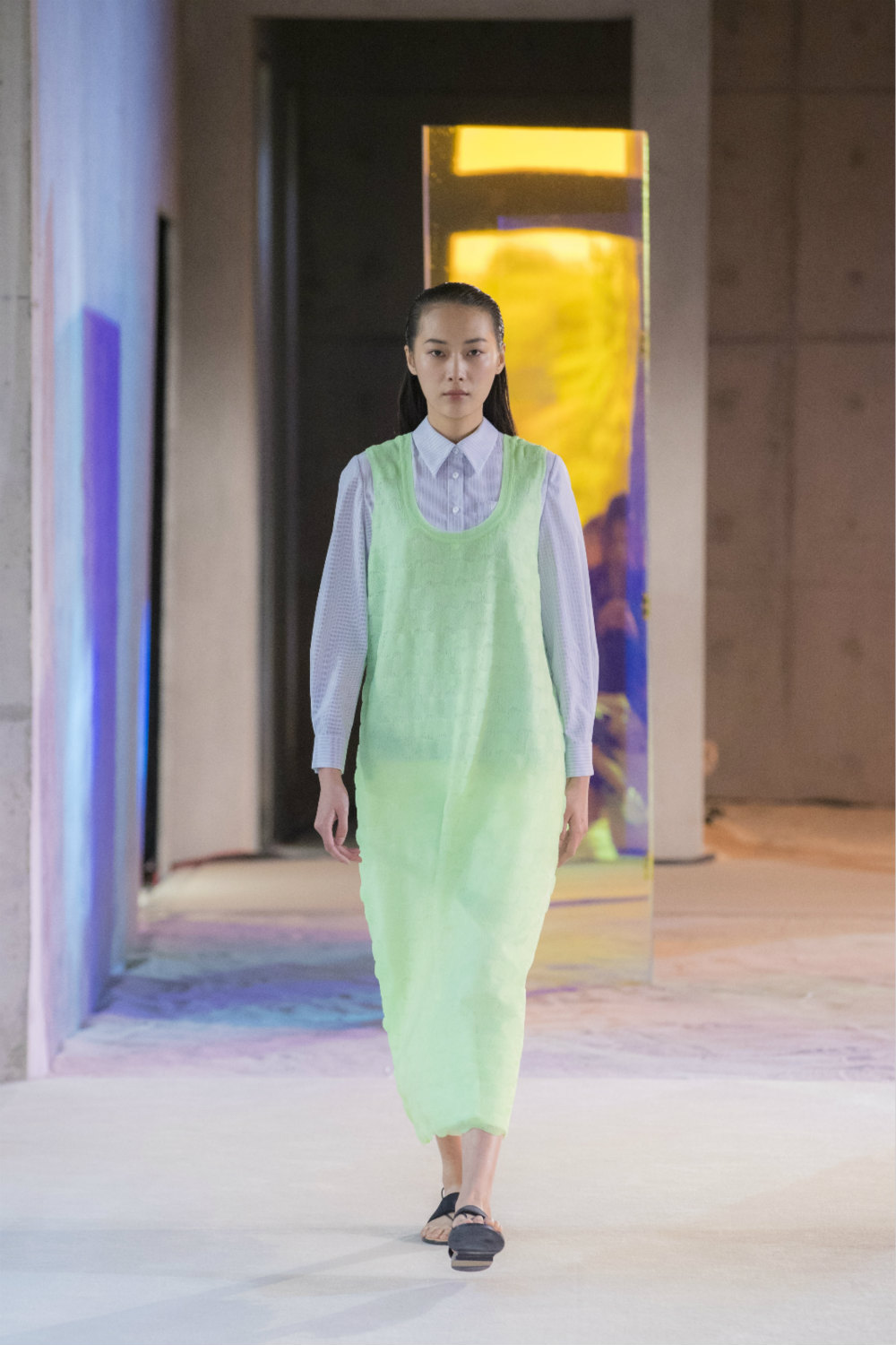 2020春夏上海时装周与秋日相携而来时,broadcast播将整座水泥架构建筑用作T台——光影裹挟着白砂,模特在阶梯间交错衣摆,镜面反射出朦胧而来的目光,女性在回旋的背影里为自己留下回眸,寻找与体验“未知的记忆/ INTO THE SUBCONSCIOUS”。