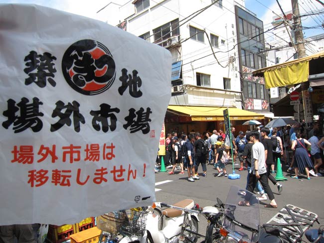2018年10月初,由于日本政府规划,筑地水产市场搬迁至3公里外的丰州市场;同时与内部水产交易市场相连的筑地场外市场,则继续留在原址——场外市场有400多家店铺,以各色餐饮店和日本土特产店为主。