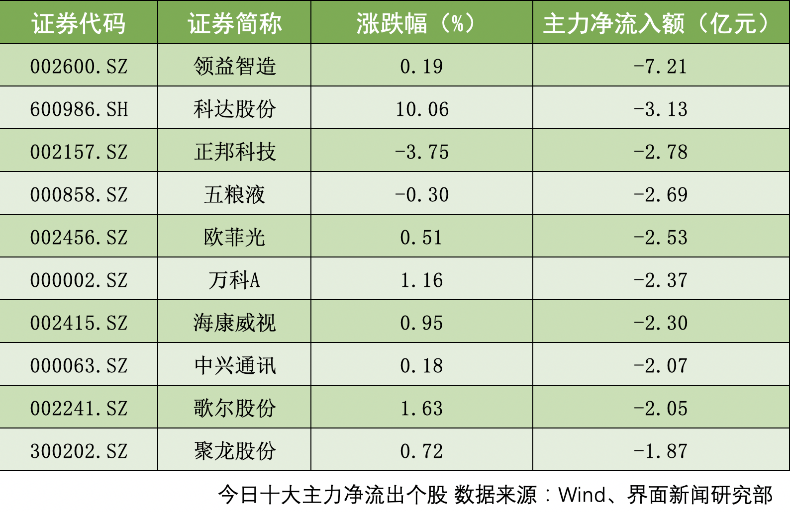 沪深两市共计31只个股主力净流出额超1亿元。领益智造(002600.SZ)、科达股份(600986.SH)、正邦科技(002157.SZ)主力净流出额位居前三,分别为7.21亿元、3.13亿元、2.78亿元。