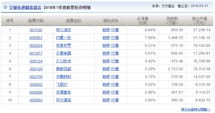交银先进制造混合2018年一季度以及二季度的重仓股(该季度为任相栋最后一个单独管理交银先进制造混合的完整季度):