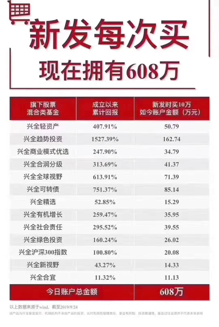 有某银行销售人士讲道;“根据测算,假如每次兴全发新基金都买10万,总投入130万元,现在你就有608万。”