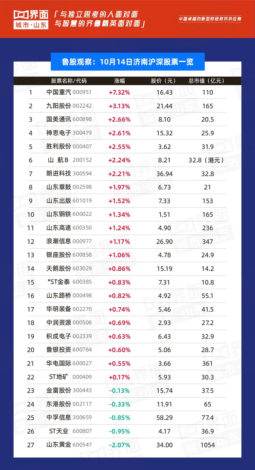 济南市涨幅榜首:中国重汽(000951)涨幅7.32%,股价16.43元,总市值110亿元。