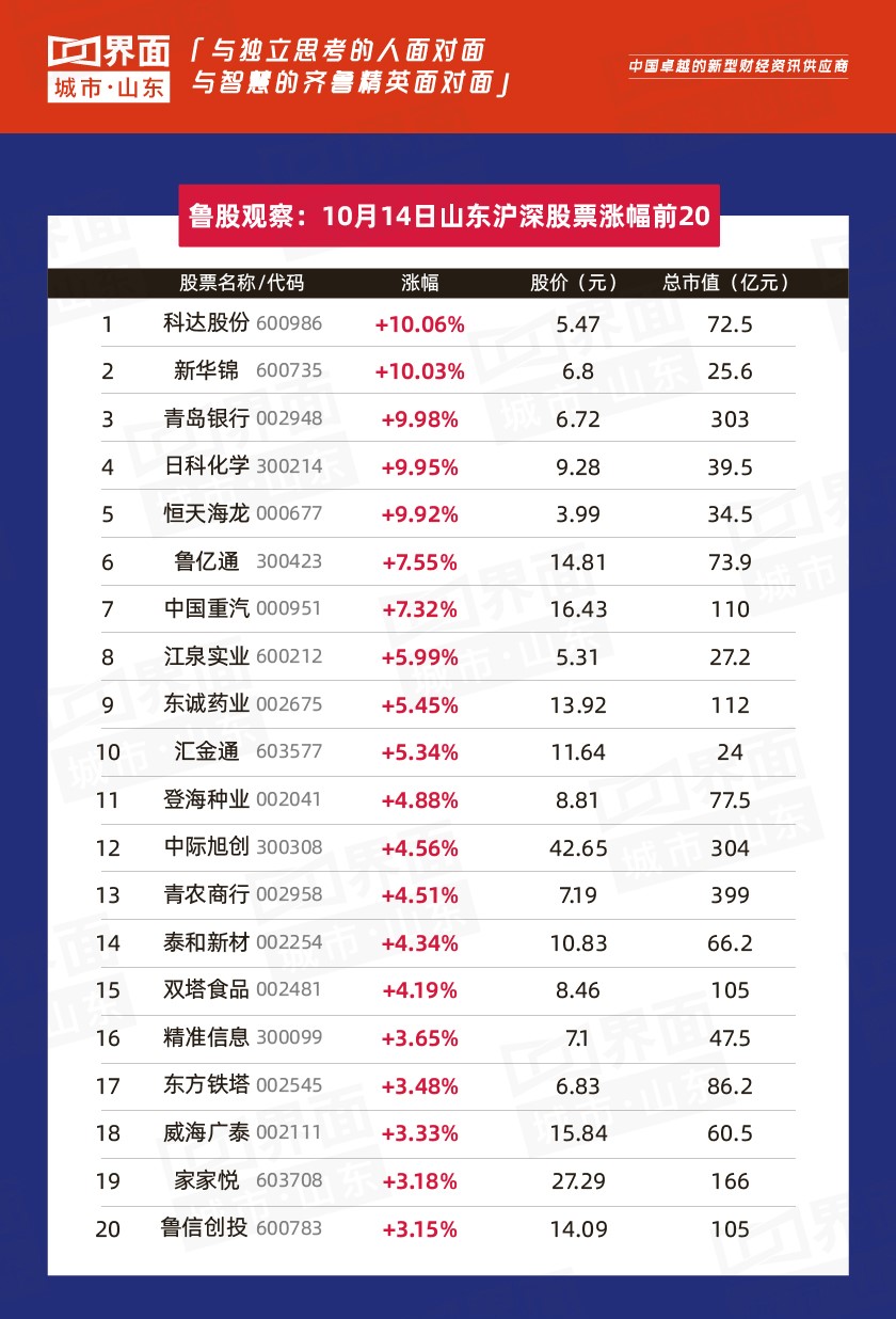 山东上市公司关键指数(指标)10月14日表现如下: