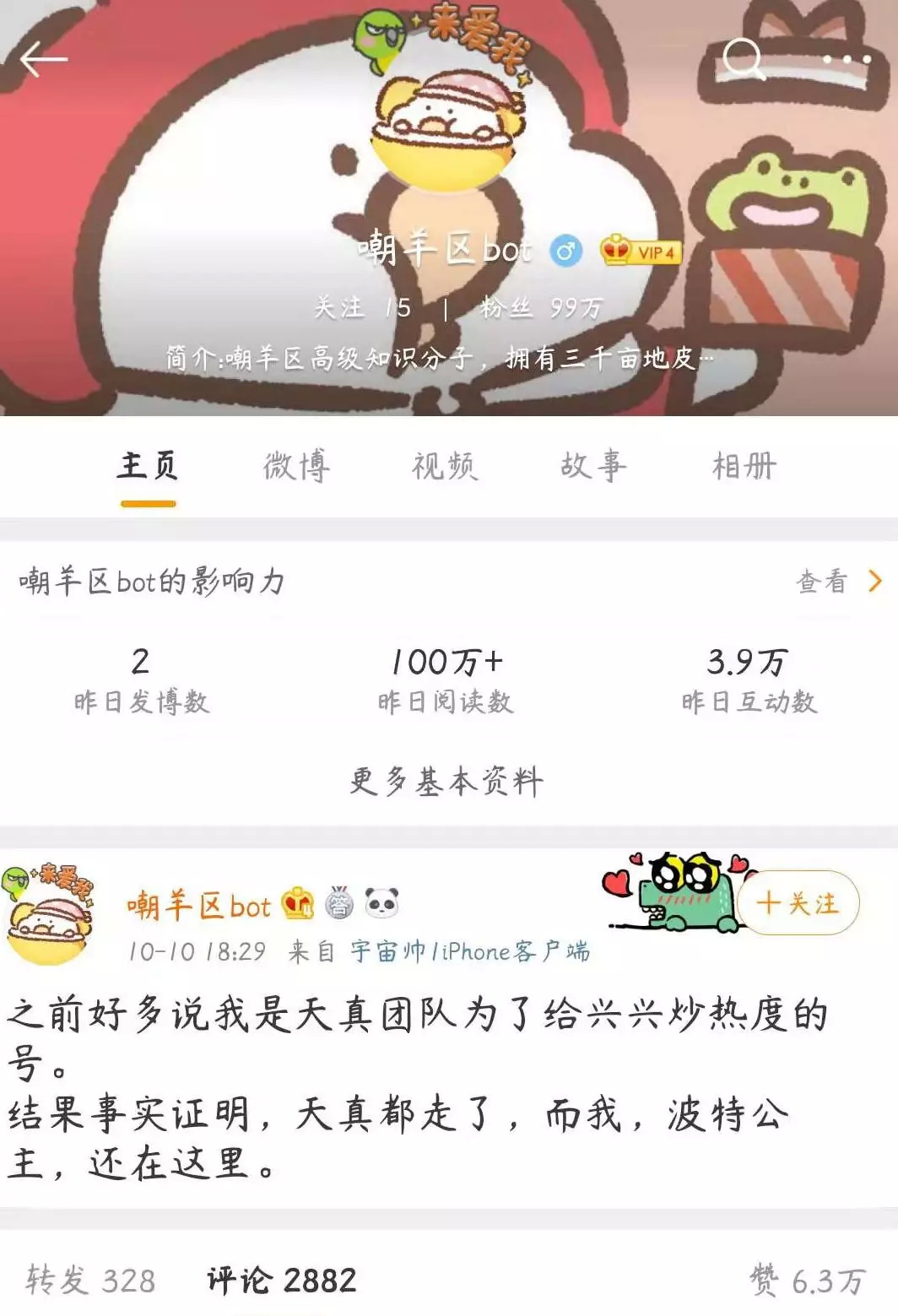 (嘲羊区bot粉丝数达99万,昨日阅读数100万+)