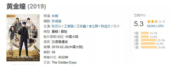 在影视剧上,张艺兴只有一部在2019年2月26日播出的由男频爽文改编的《黄金瞳》,豆瓣评分仅有5.3,而在电影方面实绩为零(《一出好戏》是在签约壹心之前)。