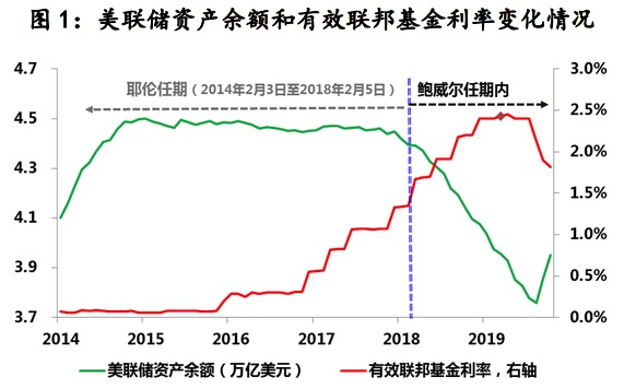 2018年2月5日鲍威尔于宣誓就任美联储主席,在之后近两年时间内美联储货币政策发生了方向性调整,由“加息+缩表”转为“降息+扩表”,截至目前,美联储已将基准利率目标区间下调两次至1.75%-2.00%,其资产余额也由8月末的3.76万亿回升至现在的3.95万亿美元。