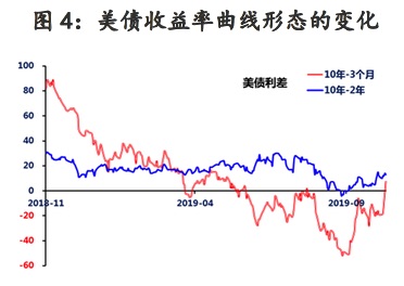 二是倒挂美债收益率的外溢性影响。今年困扰全球金融市场和美联储的重要事件之一就是美债收益率的倒挂。自2018年11月份,(5年-3年)美债和(5年-2年)美债收益率先后倒挂之后,今年3月以来,(10年-3个月)美债收益率也开始倒挂,8月份(10年-2年)美债收益率还曾一度倒挂,随着美债倒挂范围持续扩大和程度的不断加深,市场对美国经济前景的担忧也在加重,因为按照既往的经验规律,美债收益率倒挂出现后1年左右,美国经济均会出现不同程度的衰退。虽然本次美债收益率倒挂是否也是美国经济衰退的前兆,仍有讨论的余地,但毕竟是已持续50余年的经验数据规律,其对市场预期依然具有巨大的心理暗示作用,而在墨菲定律下,这种心理暗示会对金融市场产生巨大外溢性负面影响,为此,美联储有责任来化解它。而就在10月8日鲍威尔宣布美联储即将扩表之后,11日10年期美债和3个月期美债的收益率就扭转了连续56天的倒挂局面。