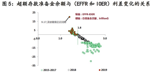 三是美元货币市场异常波动的催化。在美联储下调存款准备金利率、美国国债供给陡增和美债估值变化引发杠杆融资投资者融资缺口扩大等多因素叠加影响下,9月中旬美元货币市场一度出现“钱荒”,隔夜回购利率曾异常飙升至10%,为此美联储于时隔10年后重启了回购操作,迄今累计已向市场注入近2000亿美元的短期流动性,相应银行存款准备金规模由9月中旬的1.38万亿回升至1.53万亿美元的水平,美元货币市场也暂时解除了恐慌情绪。但是“美元荒”的乍现,客观上表明前期美联储对市场流动性的判断出现了明显偏差,为此他需要纠正此种偏差,而这也是美联储重回扩表的主要诱因之一。
