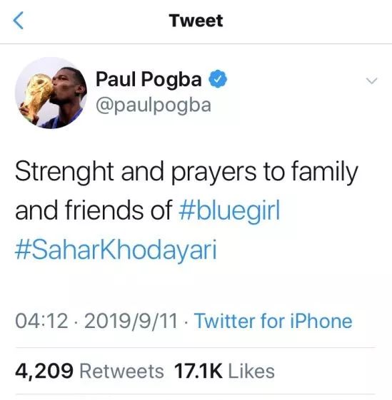 前伊朗国家队队长阿里-卡利米以及当地球迷纷纷发起#BlueGirl#的活动悼念她,并发声呼吁伊朗解除对于女性看球的禁令。