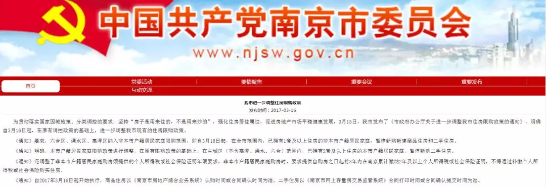 在此之前,南京的限购政策颇为严格。根据南京市于2017年3月15日出台的《进一步调整住房限购政策的通知》,明确规定自3月16日起,外地人在六合区、溧水区、高淳区范围内只能新购1套住房,同时,外地人在申请开具购房证明时,要提供过去3年内在南京累计满2年的个税或社保证明,且不允许通过补缴的方式获得购房资格。