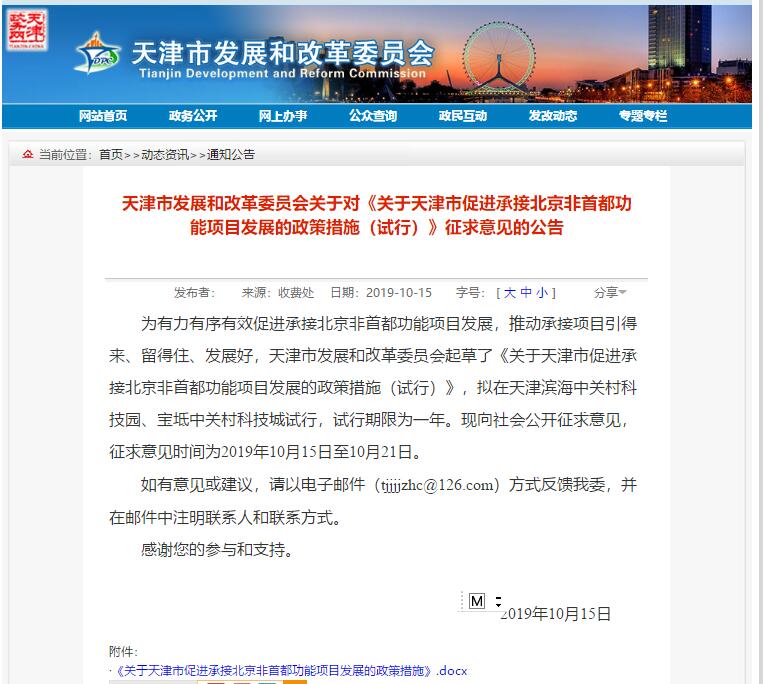 今日(10月15日)晚间,天津市发改委网站发布消息称:为鼓励人才来津工作落户,天津市发改委起草了《关于天津市促进承接北京非首都功能项目发展的政策措施(试行)》,并公开征求意见。拟在天津滨海中关村科技园、宝坻中关村科技城试行,试行期限为一年。现向社会公开征求意见,征求意见时间为2019年10月15日至10月21日。