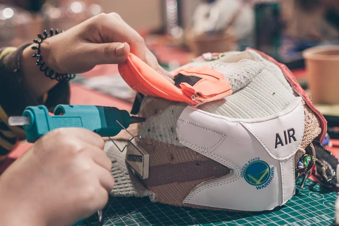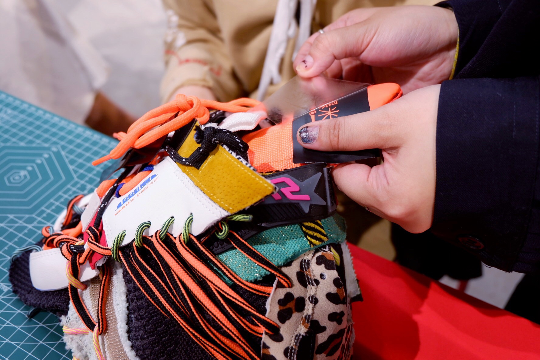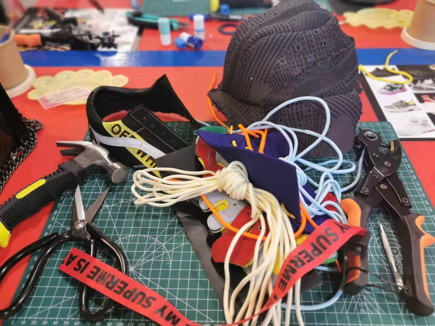 参与者会拿到一个用莆田爆款鞋材料制成的帽胚。上面已经打好了孔,为覆盖其他材料做准备。接下来可以挑选拆解好的莆田鞋材料进行创作,材料中有能明显看出鞋子轮廓的鞋面、各式鞋带,还有具有莆田特色的山寨品牌标识等素材。