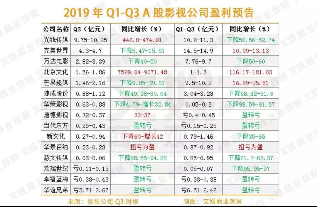 截止到今晚,A股大部分的影视公司已经披露完自己的2019年前三季度业绩预告,交出了2019年Q3及1-9月份的净利润区间,文娱商业观察统计了15家影视公司的业绩情况,发现情况依然不容乐观。