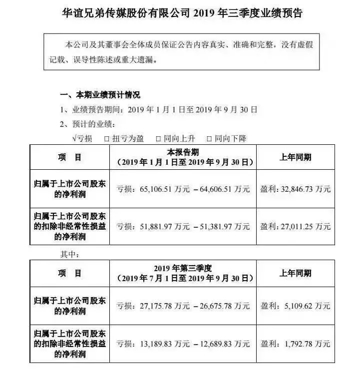 不论是Q3单季度还是2019年1-9月,华谊兄弟都是最让人揪心的一家公司,分别亏损2.7亿和6.5亿元,成为A股影视公司的“亏损王”,这距离2015年年度“盈利王”仅仅过去不到4年的时间,华谊境况转变之大让人唏嘘不已。