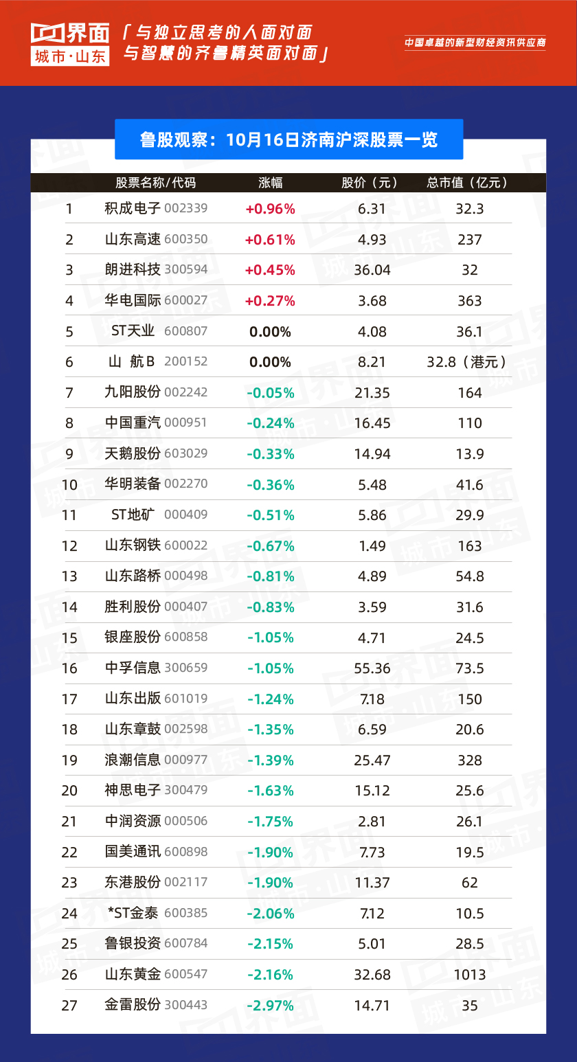 10月16日,山东省内沪深股票仅有57只个股收涨,144只下跌,7只与上一个交易日收盘价持平;