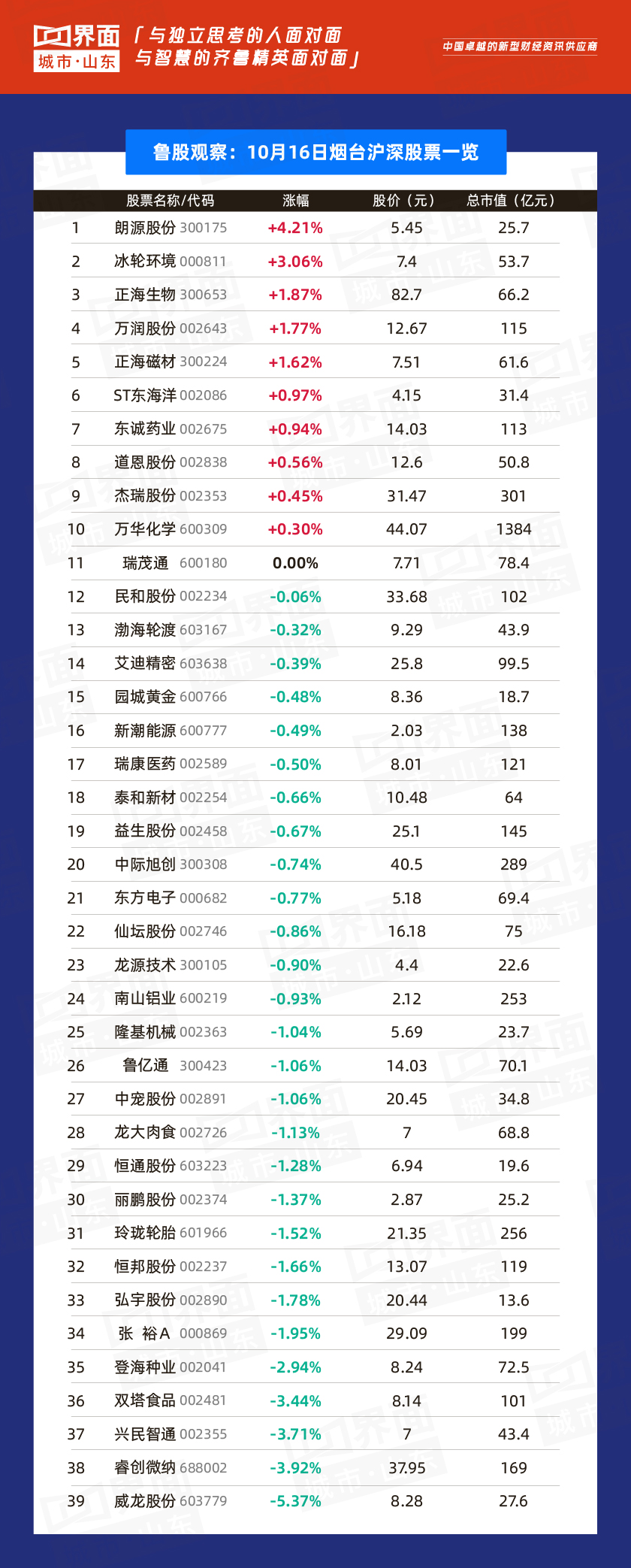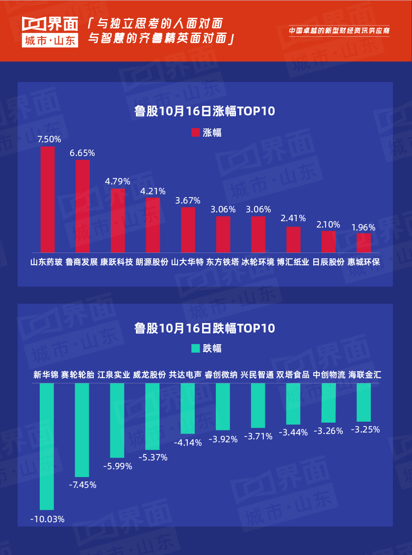 受大盘影响,10月16日山东省内沪深股票仅有57只个股收涨,144只下跌,7只与上一个交易日收盘价持平。淄博企业山东药玻(600529)涨幅7.5%,股价收于26.8元,涨幅领跑全省。