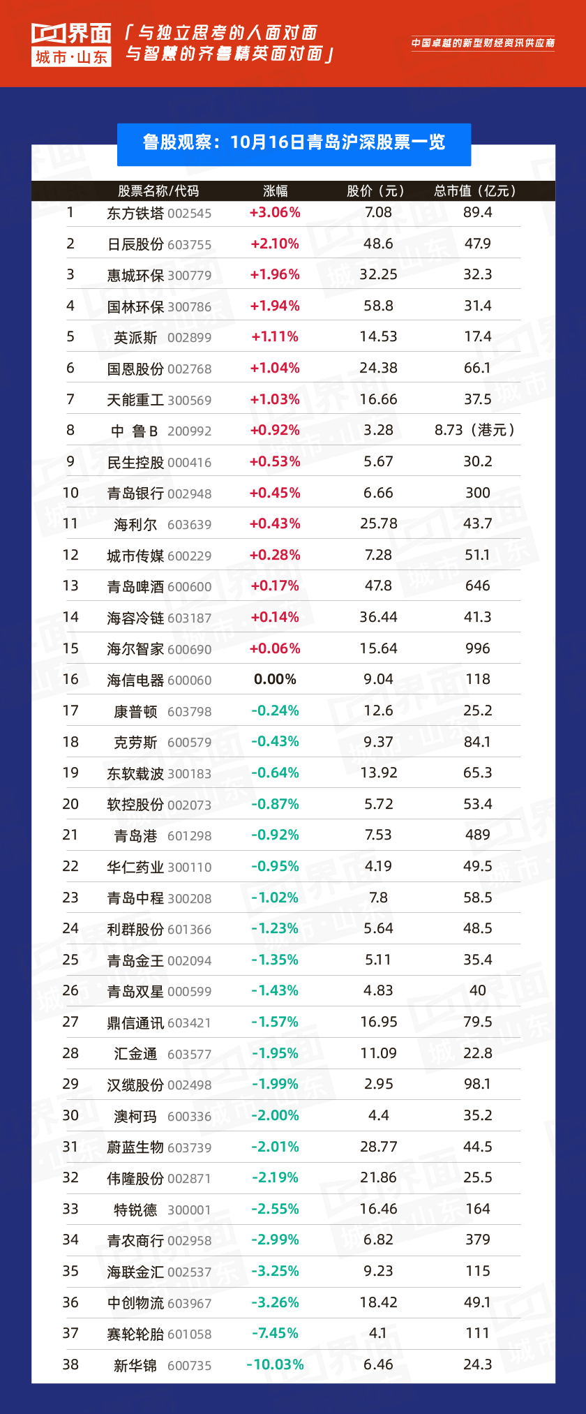 青岛市涨幅榜首:东方铁塔(002545),涨幅3.06%,股价7.08元,总市值89.4亿元。