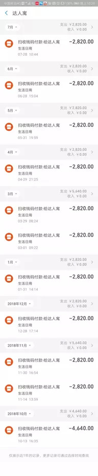 郭女士向达人寓支付房租记录