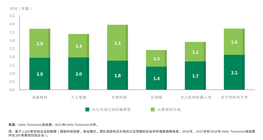其次,深科技从基础科学发展为可实际应用的技术需要一段时间的沉淀。如今随处可见的人工智能也经历了科研人员数十年的努力,方才被开发出来,量子计算机同样经历了多年的研发。而从走出实验室到商用还要耗费数年的时间。据统计,人工智能、生物科技、高薪材料和光子学&电子学等技术需花费超过3年的时间才能成功进入市场,而耗时最短的区块链技术也需要约2年。