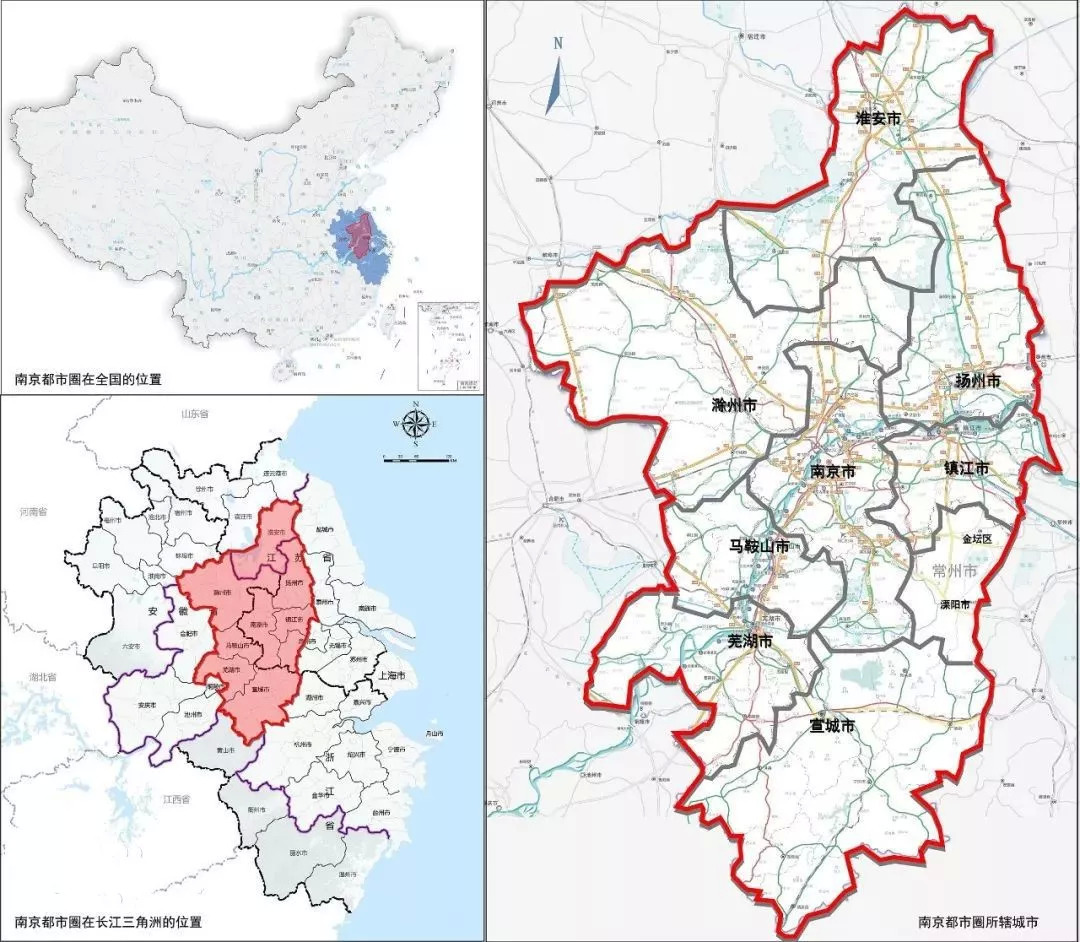 截至目前,南京都市圈成员城市有:南京、镇江、扬州、淮安、马鞍山、滁州、芜湖、宣城八个城市,包含32个市辖区、9个县级市(句容、丹阳、扬中、仪征、高邮、天长、明光、宁国、溧阳)和20个县,总面积已达6.46万平方公里。