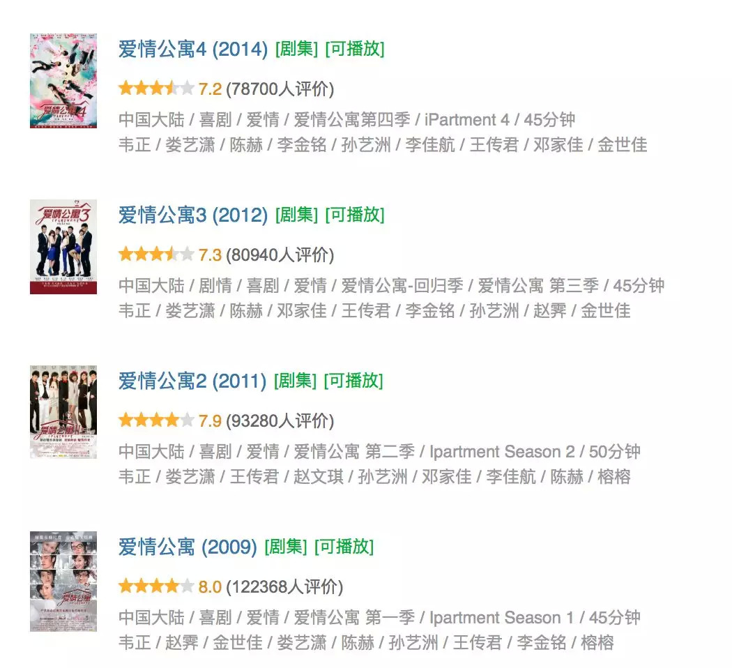 集幽默、温情和陪伴于一体的《爱情公寓》,弥补了内地情景喜剧的空白,成为了一代青年下饭的娱乐消遣。截至目前,《爱情公寓》四季评分都在7分以上,打破了剧集“火不过三”的魔咒。其中,第四季上线首日两集播放量快速破亿,被封为2014开年神剧。