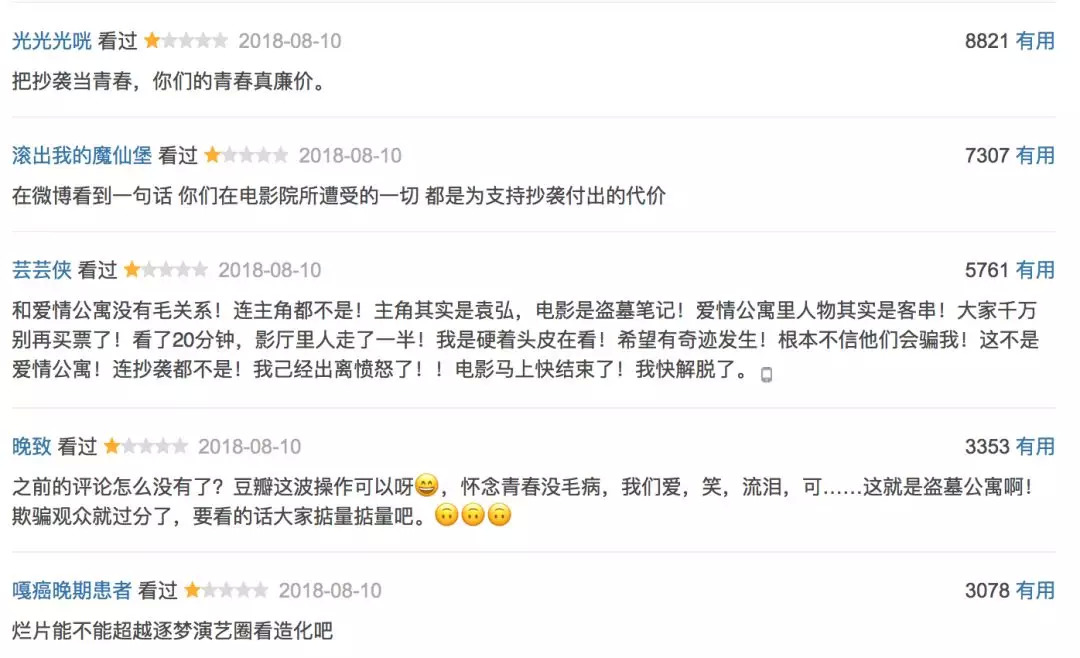 而《爱情公寓》电影的出现,使得这一IP口碑全面崩盘。老粉见识了情怀韭菜的残酷,路人学到了套牌电影的操作。没有预告、没有点映,《爱情公寓》猝不及防地给观众演了出盗墓戏。最终,这部电影豆瓣评分停在了3.1,略胜《逐梦演艺圈》。