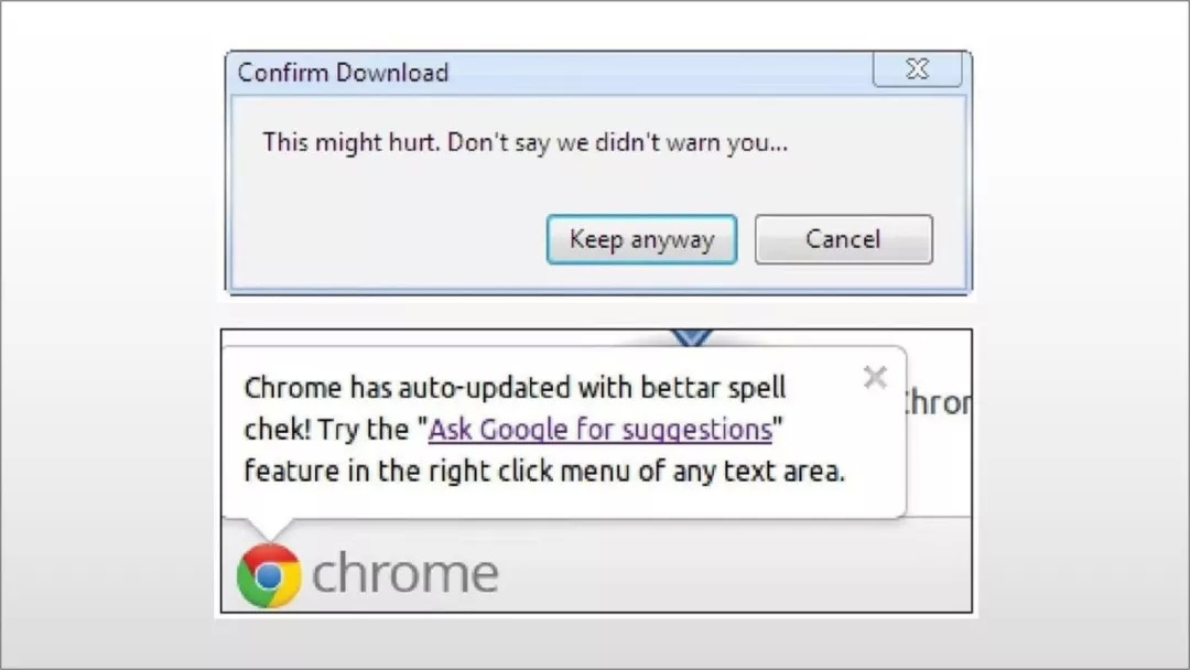 例如,“有点小情绪的提示框”,当chrome下载一个可能给用户带来损害的文件时,浏览器就回弹出提示:“你下载的文件有害,别说我没提醒你!”再如,chrome拼写检查功能上线时,提示框中的文本充满了拼写错误,既体现了产品功能的作用,表现方式也给人惊喜和幽默感。