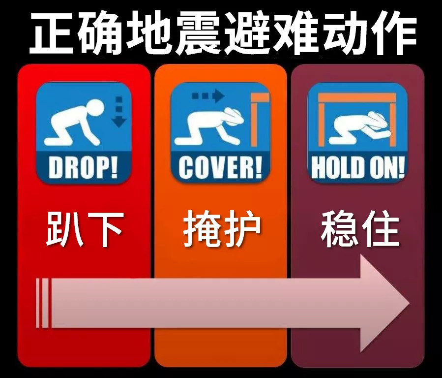 所谓趴下、掩护、稳住,就是:放低姿态,先保护自己的安全,迅速找一张坚固的桌子掩护躲避,握紧桌脚并保护头部,等待地震结束,同时注意掉落的家俱和物品。再跟小编默念一次:趴下、掩护、稳住。