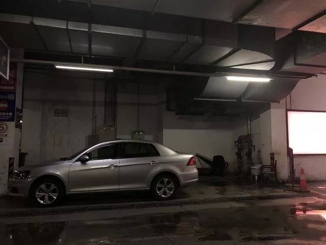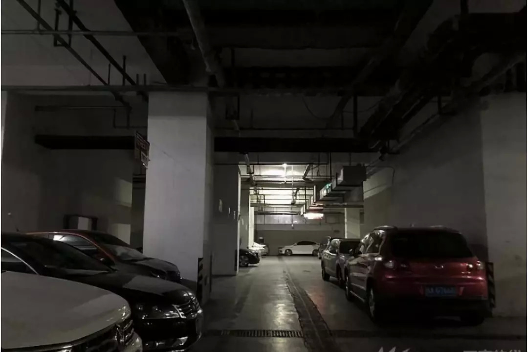 整个地下停车场的灯光较暗,很多车库排水沟积满杂物,散发着异味,车库很多地方都有积水。