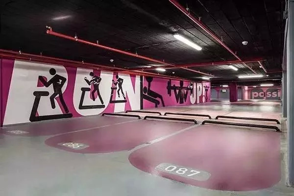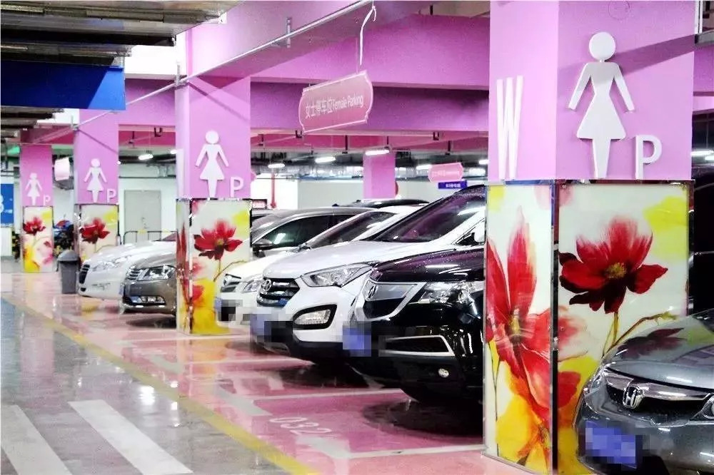 粉红色的主题设计,很容易就能辨别出来。车位附近的柱子上还特地做了代表女性的人物造型。
