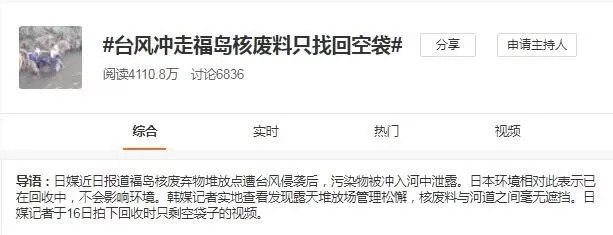 而就在13日,由台风海贝思所引发的洪水,将一批装有核辐射污染物的垃圾袋冲走,进入附近河流。据《朝日新闻》报道,在福岛县田村市的核污染物存放地约存放着2667袋福岛核电站辐射污染物,其中一部分已经进入附近河流。今日,#台风冲走福岛核废料只找回空袋#话题也登上微博热搜。