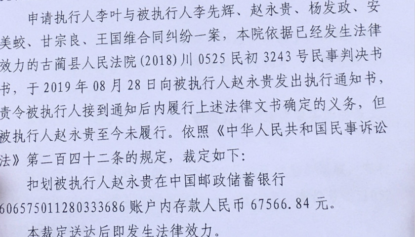 但我始终没有料到,会真的执行判决。直到我发现,我在中国邮政储蓄银行存下的退休金225400元被冻结了,取不出钱,而且被强制执行扣划了67566.84元。之后,李先辉家的三头牛也被查封,甘宗良的儿子汇给父母的2000元治病钱也被法院扣划执行。我们还都收到了古蔺县人民法院发出的《报告财产令》和《限制消费令》。
