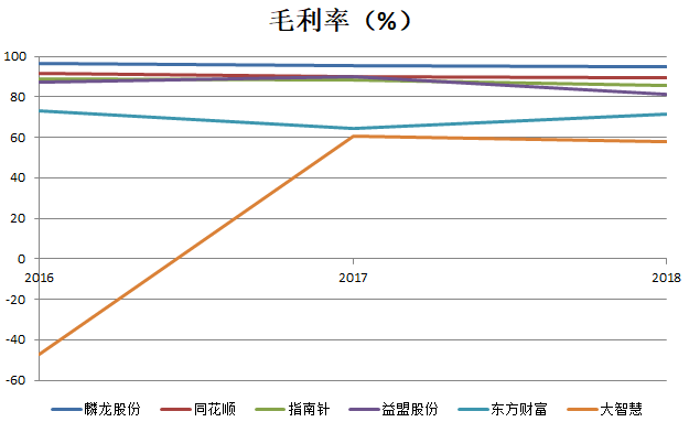 从毛利率来看,公司基本处于行业中游水平,毛利率近几年处于85%至90%之间,因2018年熊市原因,公司毛利率有小幅下滑。