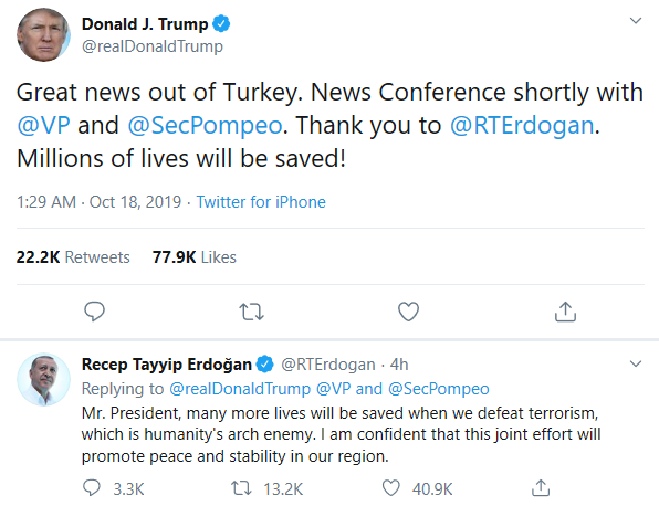 美土宣布达成临时停火协议后,美国总统特朗普18日凌晨2点左右连发两条推文表示庆贺,还特别@土耳其总统埃尔多安表达感谢。埃尔多安随即回复特朗普的推文称:“如果我们战胜人类最大的敌人恐怖主义,那将会有更多的生命被拯救。我相信,这一共同努力将促进地区和平与稳定。”