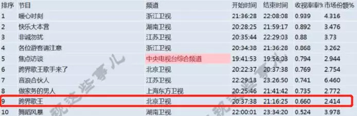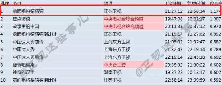 根据CSM59城数据显示,《蒙面唱将猜猜猜》在10月13日播出后,收视率为1.174%,居卫视同期综艺收视冠军;《跨界歌王》则以0.66%的收视率,在当日卫视综艺中居第9位。