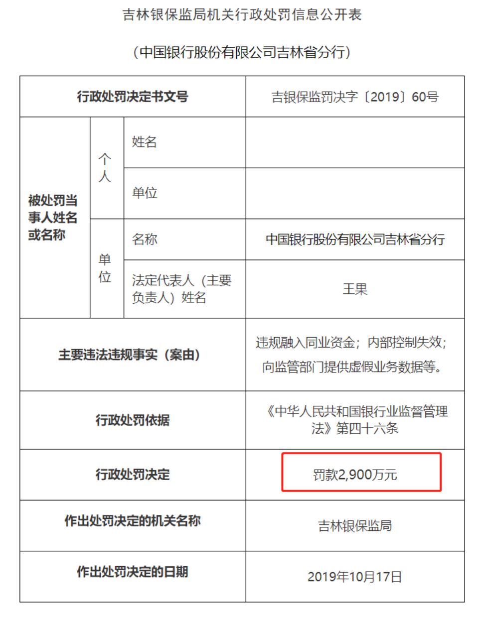 其中,中国银行吉林省分行副行长窦玉萍因对中国银行股份有限公司吉林省分行违规融入同业资金,内部控制失效致使业务档案管理混乱,向监管部门提供虚假业务数据等负管理责任,同样被给予禁止3年从事银行业工作的行政处罚决定。