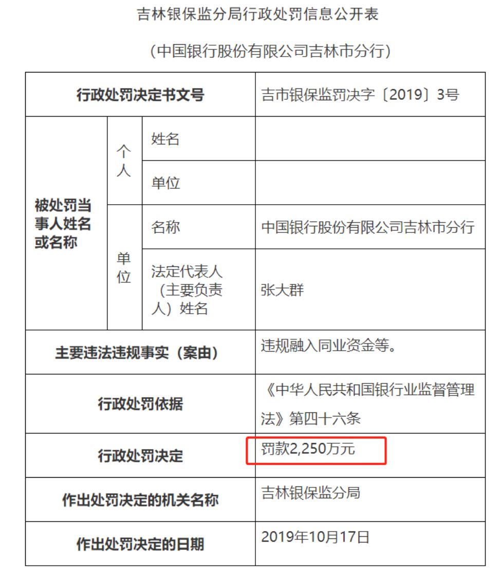 18日晚间,吉林银保监局通报,依法查处中国银行吉林省分行违规融入同业资金事件,中国银行吉林省分行和吉林市分行合计被罚款5150万元。