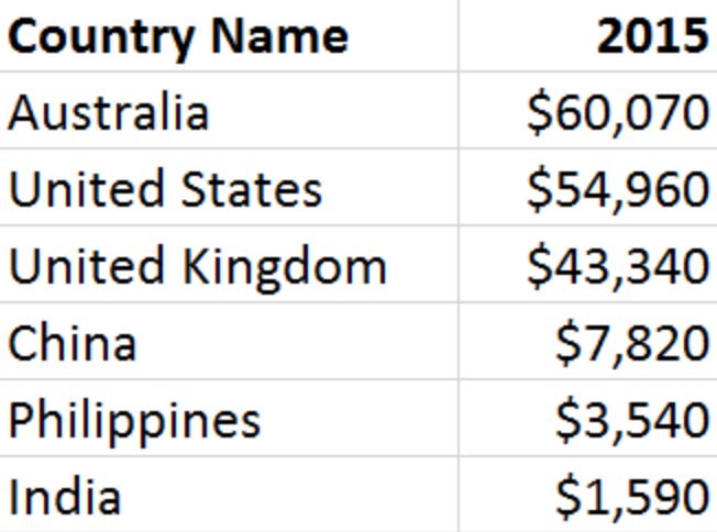 一名负责辉瑞集团亚太地区的软件架构师Troy Hunt,与印度、中国、菲律宾三地的数十个供应商,完成了上百个项目。他对比了2015年三地的工资数据,与英美国家形成了巨大的差异。