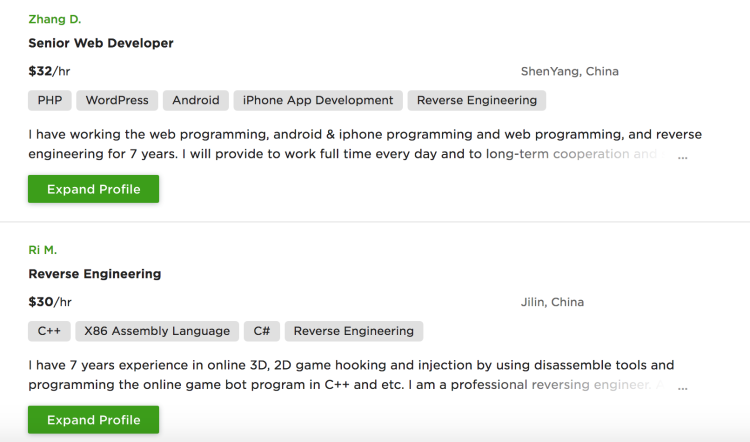 来自沈阳、吉林的工程师们,也把自己挂在了外包服务的网站上。他们的时薪在30美元到40美元,约合210元到280元人民币,已经在当地属于不错的薪资。