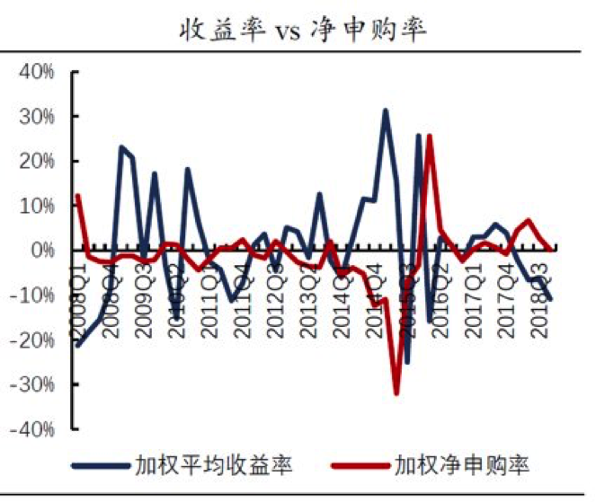(注:因为2007年净申购率过高(2007Q3达到了407%),使得其他年度的数据较难看清,我们将2007年的部分大额净申购率剔除,从2008年之后的数据开始观察。)