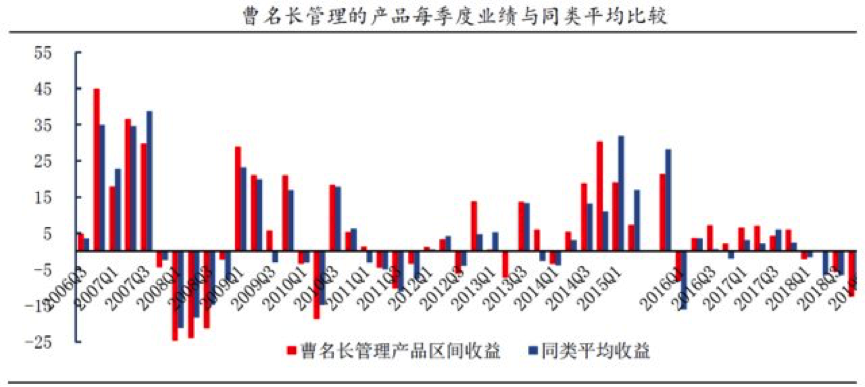 以我司曹名长为例,截止2018年底,曹名长的历史几何年化收益率达13%。(wind)但从他过去13年的公募投资经历来看,也时常会有阶段性跑输同类、跑输市场的时期,比如曾经也有过连续5个季度跑输同类的情况、也曾有过单季度排名后10%的情况(2008Q2、Q3,2013Q2,2015Q2)。不过,假如我们稍微拉长时间,看他在不同市场风格期内的表现,我们会发现曹名长有近65%的时间能够排在市场的前1/3。由此可看出,如果选择了综合实力强劲的长跑型基金经理,短时间里表现不太好往往也并不影响最终他可能为您创造超额回报。