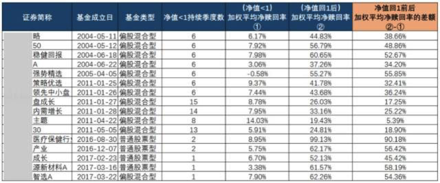在下表里,我们筛选出16只在不同时间段发行成立的新基金,他们有一个共同特点:净值在成立之后没有立即上涨,而是在1以下徘徊,之后净值回到1以上。可以发现,在净值<><10%,赎回者寥寥。而当净值回到1后,净赎回率大增、基本都>40%。我们再看下表的最后一列,可看出,净值回1之后赎回率基本都增加了30%以上。也就是说有不少投资者宁愿等1个季度、2个季度、6个季度、甚至15个季度,都不太愿意赎回净值在1以下的基金。