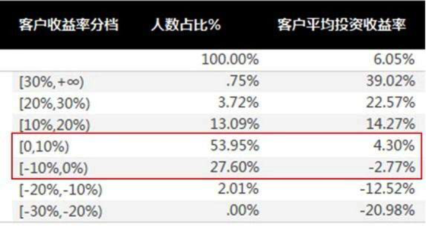 买了这只基金的客户,平均只赚到了6.05%。虽然有7成客户赚了钱(收益>0%),但一半以上的客户,都是只赚了几个点。而收益在30%以上的,占比竟然只有不到1%。而有8成的客户收益都在-10%到10%之间,也就是说,绝大多数客户都是微亏或者小赚,基本没有享受到基金业绩上涨带来的巨大收益。